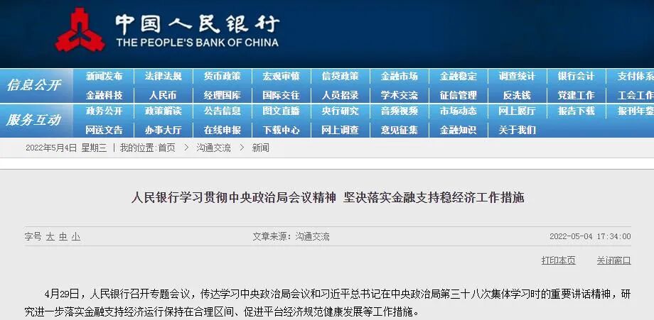 据“中国人民银行”网站5月4日消息,4月29日,人民银行召开专题会议,传达学习中央政治局会议和习近平总书记在中央政治局第三十八次集体学习时的重要讲话精神,研究进一步落实金融支持经济运行保持在合理区间、促进平台经济规范健康发展等工作措施。