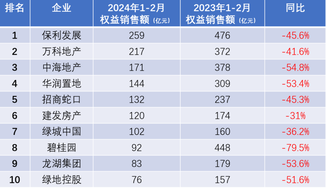 根据克而瑞最新统计,2024年前两个月,百强房企的销售额同比下跌48.8%!